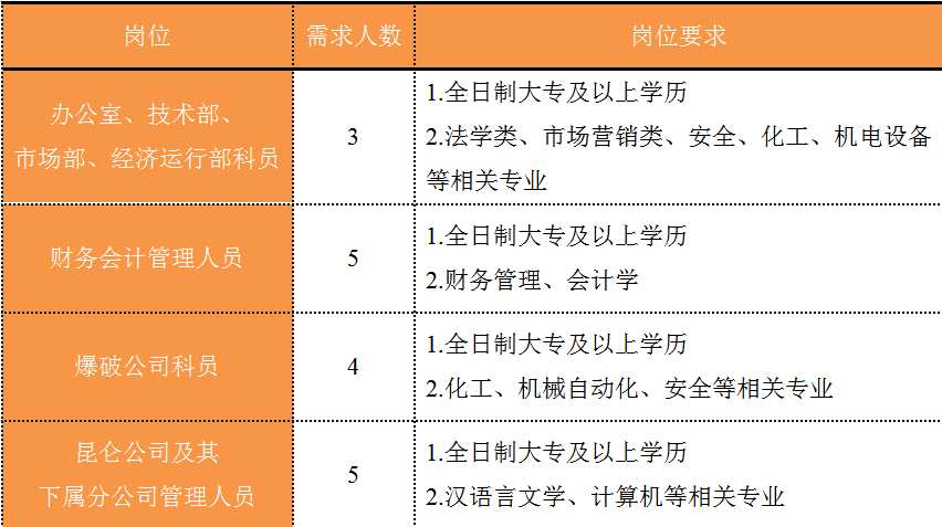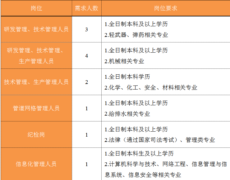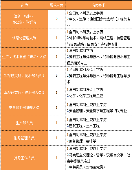 福建省機電(控股)有限責任公司(福建省國防科技工業(yè)公司)是由原省國防科工辦所屬企業(yè)為主,原省機械廳所屬企業(yè)劃入組建的省國資委出資的國有企業(yè),現(xiàn)有全資、控股和參股企業(yè)22家。 在閩唯一一家地方軍工企業(yè); 民爆物品生產(chǎn)與銷售資質(zhì)、軍品科研與生產(chǎn)資質(zhì)、硝酸銨生產(chǎn)與銷售資質(zhì)、營業(yè)性爆破作業(yè)單位一級資質(zhì)、礦山工程施工總承包一級資質(zhì)、環(huán)保工程專業(yè)承包三級資質(zhì); 國家甲級設計院,擁有工業(yè)與民用建筑工程設計、咨詢、工程監(jiān)理等綜合資質(zhì); 華東地區(qū)最大的硝酸銨生產(chǎn)企業(yè)... 省級重點實驗室 1個 省級工程技術(shù)研究中心 2個 省級企業(yè)技術(shù)中心 3個 省級技能大師工作室 2個 五險二金 帶薪年假 工會福利 健康體檢 午餐補貼 通訊補貼 文體活動...... (一)基本條件 1.具有中華人民共和國國籍,擁護中國共產(chǎn)黨的領導,熱愛社會主義; 2.遵紀守法,無違法違紀違規(guī)等不良記錄; 3.具有良好的身體素質(zhì)和心理素質(zhì); 4.具備符合崗位要求的文化程度和工作能力。 (二)資格條件 2024年應屆高校畢業(yè)生(含:①2024年當年度應屆高校畢業(yè)生,以畢業(yè)證書落款年度為準,已簽訂就業(yè)協(xié)議、勞動合同、繳交社保等均不影響應屆生身份人認定;②2023年度畢業(yè)、具有工作經(jīng)歷及社保繳交記錄的高校畢業(yè)生),且在2024年1月1日至2024年12月31日期間取得學歷學位證書;2024年1月1日至2024年12月31日期間取得國(境)外學位、完成教育部留學服務中心學歷認證后初次就業(yè)的留學回國人員。 聯(lián)系人:蔣女士 聯(lián)系電話:0591-62790002 工作地點:福建福州 1.福建兵工裝備有限公司 聯(lián)系人:吳先生 聯(lián)系電話:0598-3838649 工作地點:福建永安、福建漳州 1.福建海峽科化股份有限公司分公司 聯(lián)系人:葉先生 聯(lián)系電話:0598-3868633 工作地點:福建永安、福建龍巖、福建福安、福建明溪 2.福建海峽科化富興建設工程有限公司 聯(lián)系人:楊女士 聯(lián)系電話:18250589968 工作地點:福建三明 3.福建民化建設工程有限公司 聯(lián)系人:鄒女士 聯(lián)系電話:13950807836 工作地點:福建省內(nèi) 4.青海青樂化工機械有限責任公司 聯(lián)系人:李先生 聯(lián)系電話:0972-8655285 工作地點:青海省海東市樂都區(qū) 5.青海海西東諾化工有限公司 聯(lián)系人:郭先生 聯(lián)系電話:13860516289 工作地點:青海省德令哈市 聯(lián)系人:李女士 聯(lián)系電話:0591-87386017 工作地點:福建福州 本次招聘采用網(wǎng)上報名方式,符合崗位招聘條件的應聘者,請如實填寫《福建省機電(控股)有限責任公司公開招聘2024年應屆畢業(yè)生報名登記表》(點擊福建省機電(控股)有限責任公司公開招聘2024年應屆高校畢業(yè)生報名登記表.docx下載),并將報名登記表(PDF版)和個人簡歷(PDF版)統(tǒng)一打包壓縮后,投遞至指定郵箱:fndic25@163.com;并將郵件標題名稱命名為“崗位+姓名+畢業(yè)院校+專業(yè)” 即日起開始接受報名,截止時間為2024年7月31日。 招聘工作按照簡歷投遞-資格審查篩選-筆試-面試-發(fā)放OFFER-體檢-公示-簽約錄用等程序進行。 資格審查貫穿招聘全過程,在招聘各環(huán)節(jié)若有發(fā)現(xiàn)報考信息不實、條件不符等情形的,一律取消應聘資格,不得進入下一環(huán)節(jié);已經(jīng)錄用的,我司有權(quán)解除勞動關系,由此發(fā)生的個人損失由應聘人員自行承擔。 按照招聘條件對應聘人員進行資格審查,擇優(yōu)確定參加筆試和面試人員。審核通過者將通過電話或郵件方式通知,審核未通過者不再另行通知。 公開招聘工作堅持“公開、平等、競爭、擇優(yōu)”的原則,嚴肅紀律,秉公辦事,嚴禁弄虛作假,徇私舞弊,全程接受紀檢監(jiān)察部門和社會的監(jiān)督。報考者有弄虛作假、違紀違規(guī)行為的,一經(jīng)發(fā)現(xiàn),均取消其應聘資格,并將有關情況通報其所在學?;騿挝弧?gòu)成犯罪的,依法追究刑事責任。