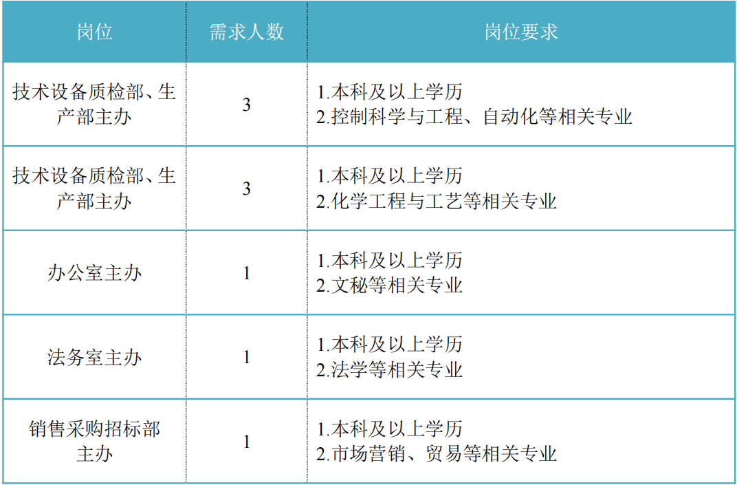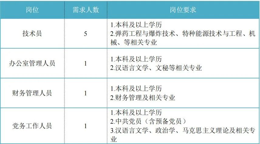福建省機電(控股)有限責任公司(福建省國防科技工業(yè)公司)是由原省國防科工辦所屬企業(yè)為主,原省機械廳所屬企業(yè)劃入組建的省國資委出資的國有企業(yè),現(xiàn)有全資、控股和參股企業(yè)22家。 在閩唯一一家地方軍工企業(yè); 民爆物品生產(chǎn)與銷售資質(zhì)、軍品科研與生產(chǎn)資質(zhì)、硝酸銨生產(chǎn)與銷售資質(zhì)、營業(yè)性爆破作業(yè)單位一級資質(zhì)、礦山工程施工總承包一級資質(zhì)、環(huán)保工程專業(yè)承包三級資質(zhì); 國家甲級設計院,擁有工業(yè)與民用建筑工程設計、咨詢、工程監(jiān)理等綜合資質(zhì); 華東地區(qū)最大的硝酸銨生產(chǎn)企業(yè)... 省級重點實驗室 1個 省級工程技術研究中心 2個 省級企業(yè)技術中心 3個 省級技能大師工作室 2個 五險二金 帶薪年假 工會福利 健康體檢 午餐補貼 通訊補貼 文體活動...... 1.具有中華人民共和國國籍,擁護中國共產(chǎn)黨的領導,熱愛社會主義; 2.遵紀守法,無違法違紀違規(guī)等不良記錄; 3.具有良好的身體素質(zhì)和心理素質(zhì); 4.應屆高校畢業(yè)生(含:①2024年度應屆高校畢業(yè)生,以畢業(yè)證書落款年度為準,已簽訂就業(yè)協(xié)議、勞動合同、繳交社保等均不影響應屆生身份界定;②2023年度畢業(yè)、具有工作經(jīng)歷及社保繳交記錄的高校畢業(yè)生;③畢業(yè)離校兩年內(nèi)未就業(yè)的高校畢業(yè)生,畢業(yè)證書落款時間應為2022年1月1日以后),具備符合崗位要求的文化程度和工作能力。 聯(lián)系人:蔣女士 聯(lián)系電話:0591-62790002 簡歷投遞郵箱:jrm008@163.com 工作地點:福建福州 1.福建兵工裝備有限公司本部 聯(lián)系人:吳先生 聯(lián)系電話:0598-3838649 簡歷投遞郵箱:yafjchn313@126.com 工作地點:福建永安 2.福建富興彩彈槍有限公司 聯(lián)系人:王女士 聯(lián)系電話:0596-3951109 簡歷投遞郵箱:292483261@qq.com 工作地點:福建漳州 3.福建永安三燕機械有限公司 聯(lián)系人:龐先生 聯(lián)系電話:13859199510 簡歷投遞郵箱:22628862@qq.com 工作地點:福建永安 1.福建海峽科化股份有限公司分公司 聯(lián)系人:葉先生 聯(lián)系電話:0598-3868633 簡歷投遞郵箱:1512059658@qq.com 工作地點:福建龍巖、福建福安、福建明溪、福建永春 2.福建海峽科化富興建設工程有限公司 聯(lián)系人:楊女士 聯(lián)系電話:18250589968 簡歷投遞郵箱:455788607@qq.com 工作地點:福建三明 3.福建民化建設工程有限公司 聯(lián)系人:鄒女士 聯(lián)系電話:13950807836 簡歷投遞郵箱:375725466@qq.com 工作地點:福建省內(nèi) 4.青海青樂化工機械有限責任公司 聯(lián)系人:李先生 聯(lián)系電話:0972-8655285 簡歷投遞郵箱:2949487975@qq.com 工作地點:青海省海東市樂都區(qū) 5.青海海西東諾化工有限公司 聯(lián)系人:郭先生 聯(lián)系電話:13860516289 簡歷投遞郵箱:417107@qq.com 工作地點:青海省德令哈市 聯(lián)系人:米先生 聯(lián)系電話:15280522275 簡歷投遞郵箱:614102992@qq.com 工作地點:福建邵武 聯(lián)系人:李女士 聯(lián)系電話:0591-87386017 簡歷投遞郵箱:396098613@qq.com 工作地點:福建福州 簡歷投遞 - 資格審查 - 筆試與面試 - 發(fā)放Offer -體檢 - 簽約錄用 有意者請將簡歷投遞至相應公司的郵箱,并將簡歷命名為“崗位-姓名-學校專業(yè)”; 即日起開始接受報名,截止時間為2024年12月31日。 按照招聘條件對應聘人員進行資格審查,擇優(yōu)確定參加筆試和面試人員。審核通過者將通過電話或郵件方式通知,審核未通過者不再另行通知。